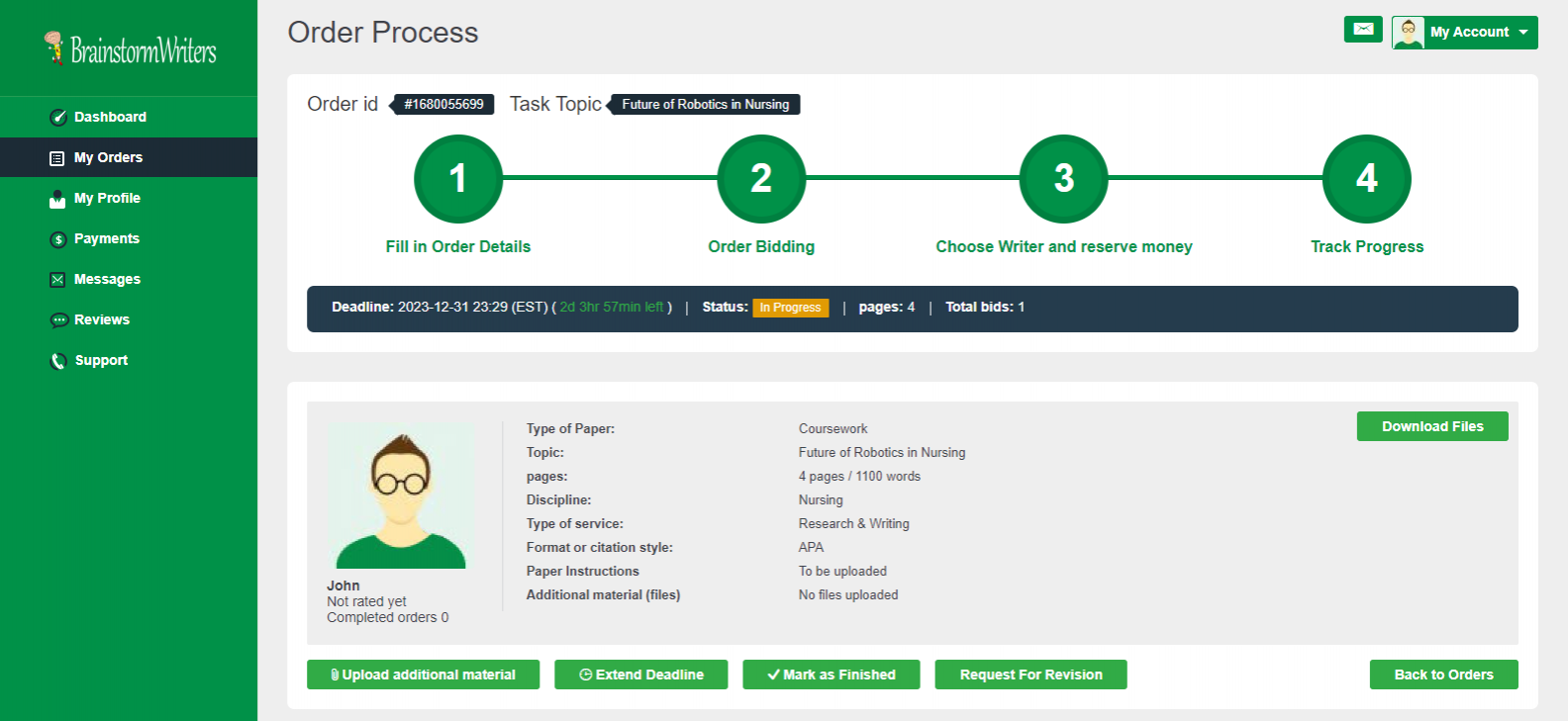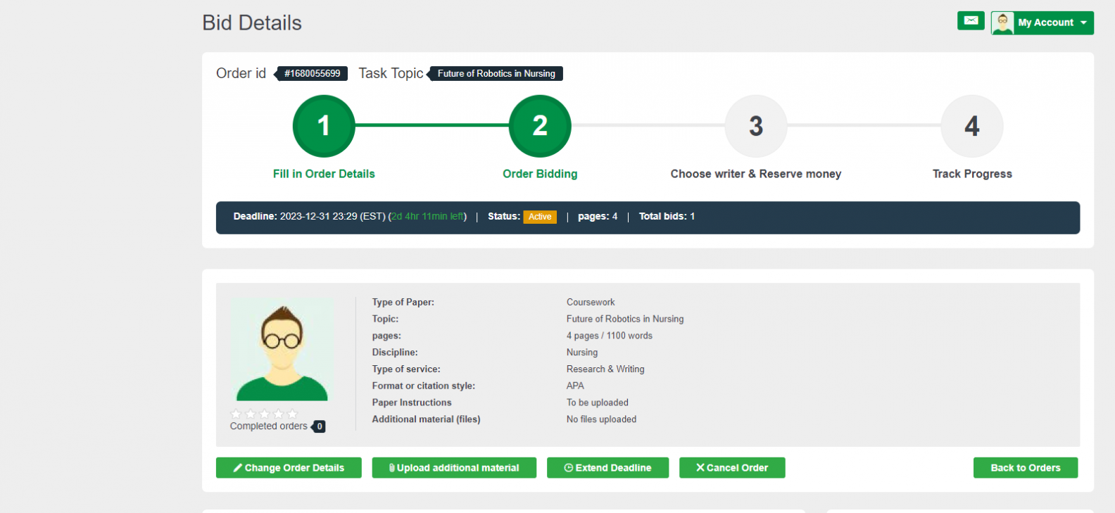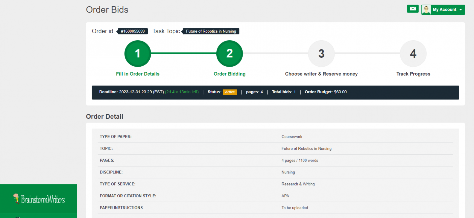 Your order will appear on your dashboard. It may take a while before you see bids from writers, but once a writer places a bid, you will see on the right side of the order. At this stage, you can click the order to open and view bids.