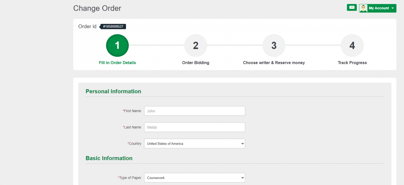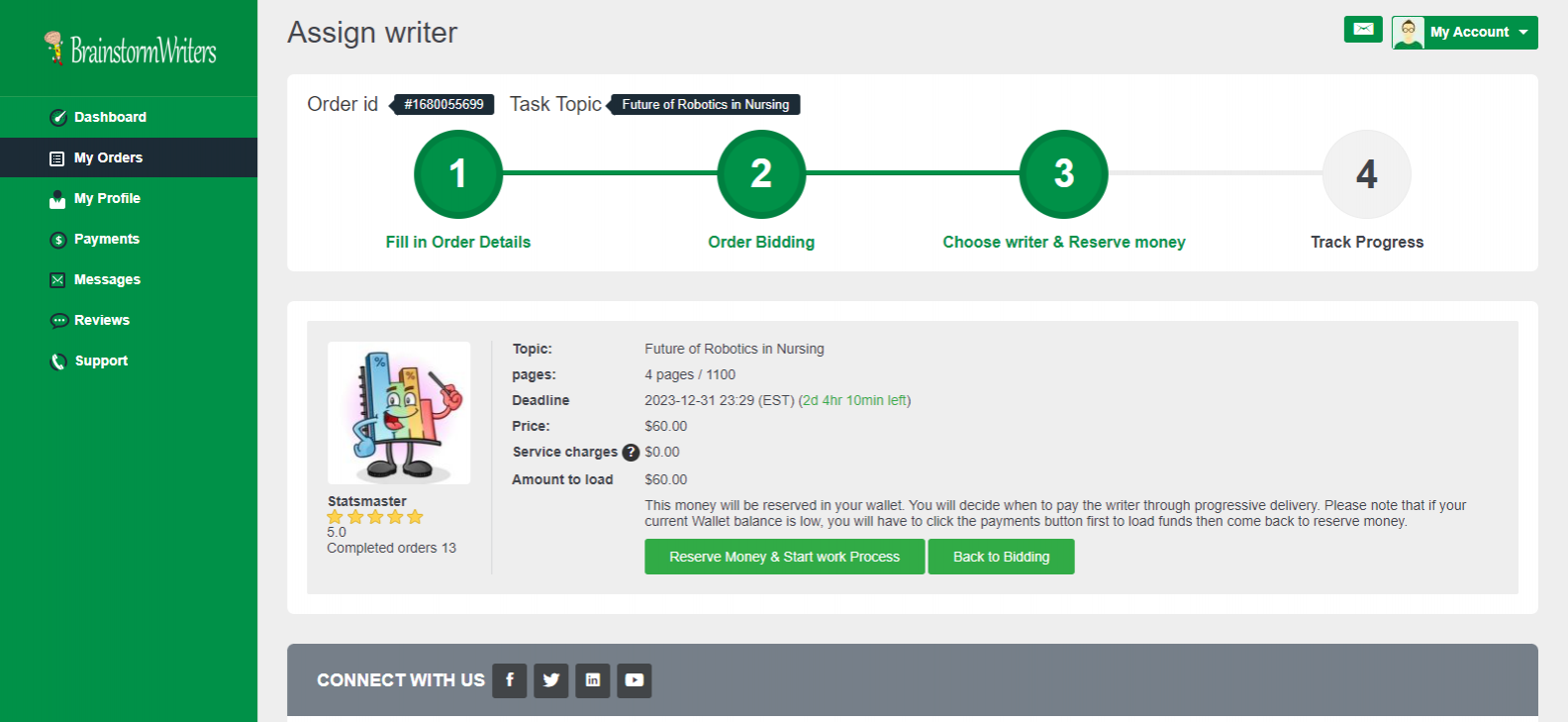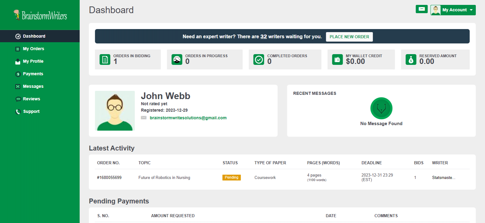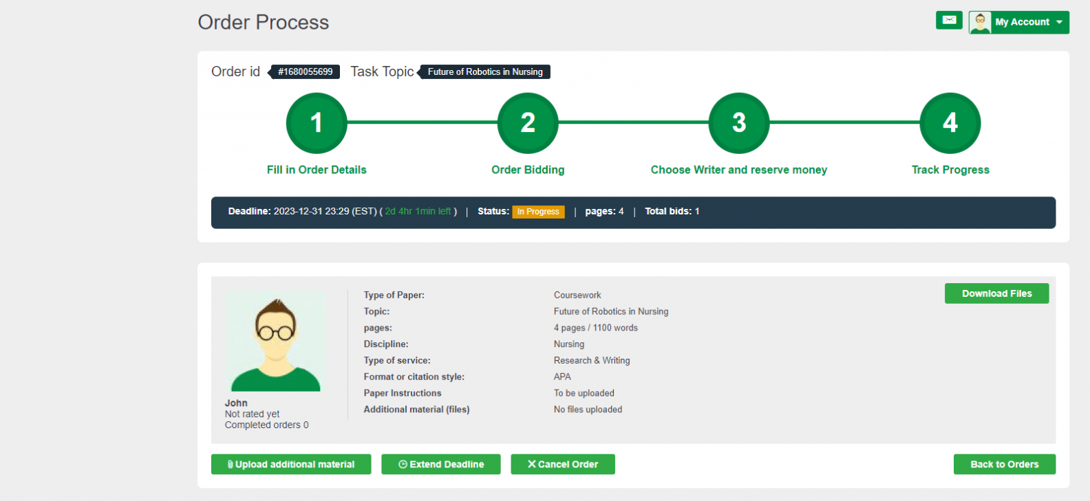Your order will appear on your dashboard. It may take a while before you see bids from writers, but once a writer places a bid, you will see on the right side of the order. At this stage, you can click the order to open and view bids.